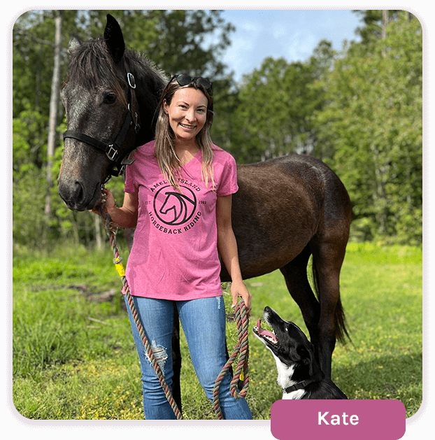 Kate has been riding horses for 3 years after working at a carriage company in South Carolina. She later worked part time at a prestigious barn where she met her riding instructor and was trained to ride English on a beautiful southern plantation. She also learned to gallop on an old airplane runway! Kate joined us in 2021 and enjoys the beautiful sunrise and sunset while meandering down the beach with her horse Lyrica.